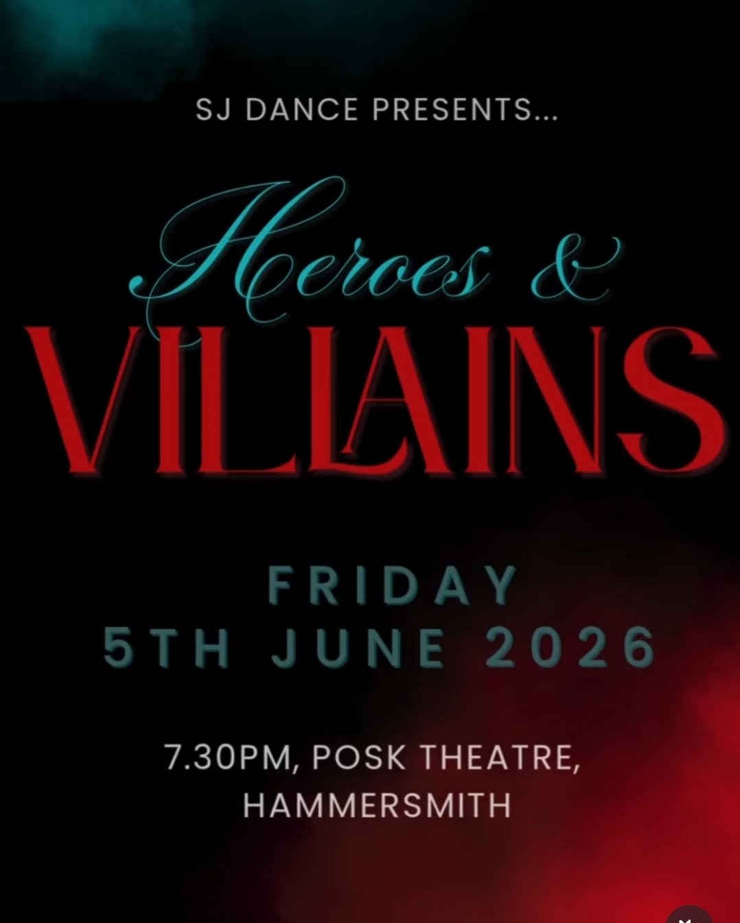 « All Events 05.06| SJ DANCE PRESENTS… Heroes & Villains June 5, 2026 @ 7:30 pm - 10:00 pm « Prev SJ DANCE PRESENTS… Heroes & Villains 5 June 2026 7.30 More information: sj-dance.com Add to calendar Google Calendar iCalendar Outlook 365 Outlook Live Details Date: June 5, 2026 Time: 7:30 pm - 10:00 pm Event Category: POSK Theatre Venue Teatr POSK 238-246 King Street London, W6 0RF United Kingdom + Google Map View Venue Website
