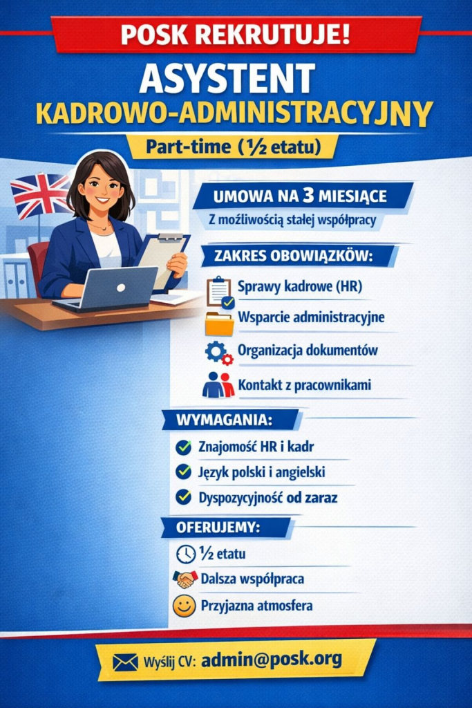 POSK poszukuje osoby do wsparcia w obszarze spraw kadrowo-administracyjnych. Wybranej osobie zaoferowane zostanie stanowisko part-time (½ etatu).
